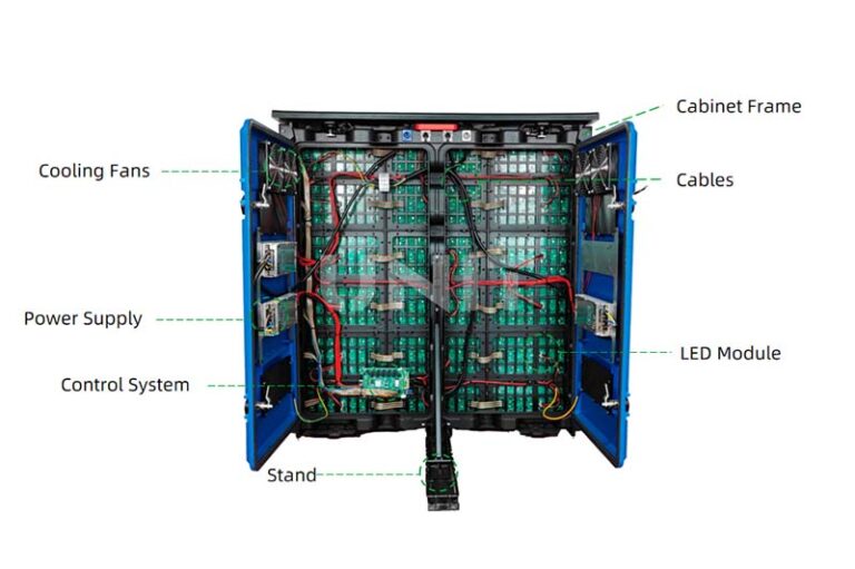 LED მოდულები (პანელები): ეკრანის ფუნდამენტური საშენი ბლოკები. მათში განთავსებულია PCB, LED ნათურები და დრაივერის მიკროსქემები; ისინი წარმოადგენენ ძირითად ზედაპირს, სადაც გამოსახულება გენერირდება.